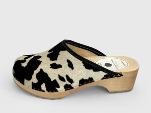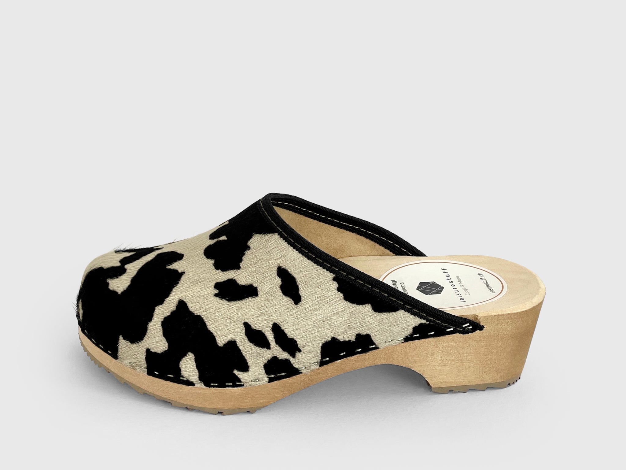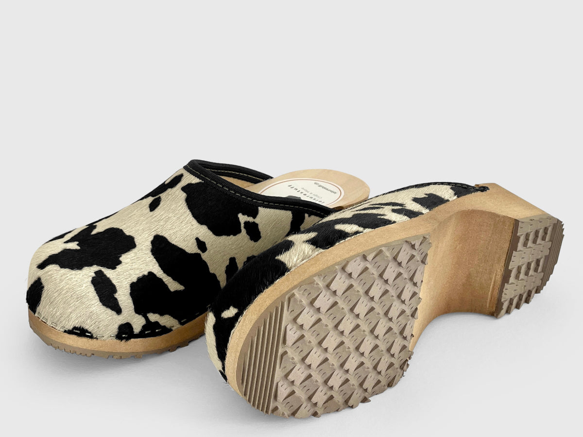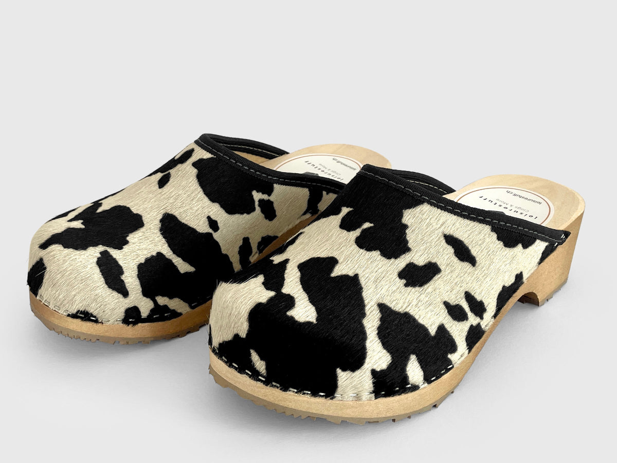 Véritable peau de vache avec lanière en cuir marron, semelle teintée marron. Un bienfait pour les pieds. En plus : ça a de l'allure et chaque modèle est unique.